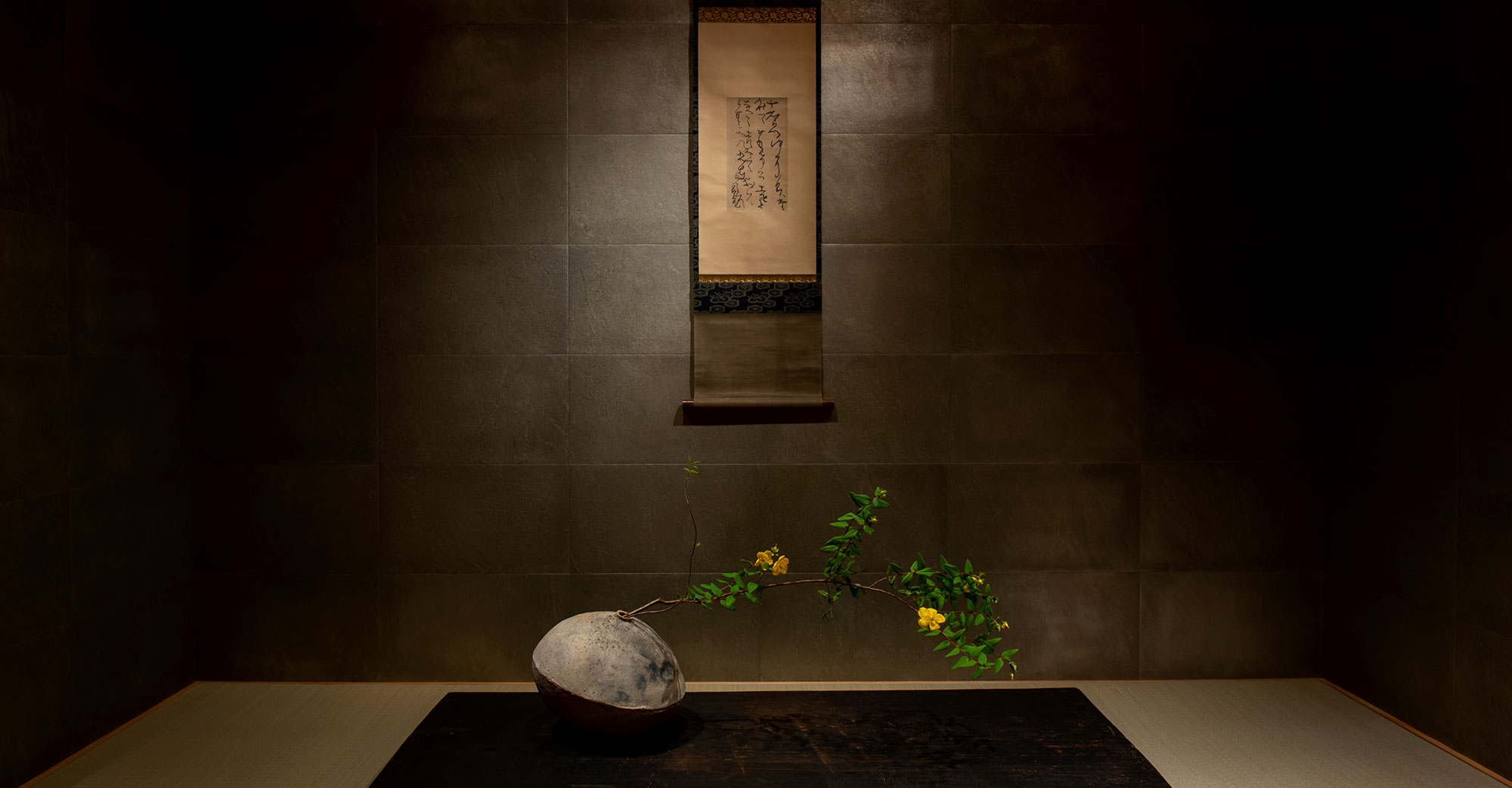 一切の華美な装飾を排した室内に、侘びた古器などをさりげなく配しました。